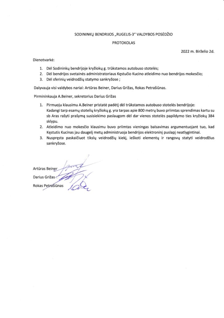 2022 m. birželio 2 d. Valdybos posėdžio protokolas SB „Rugelis-3“ Valdyba Kontakto telef.: +370-610-04934 Grįžti atgal